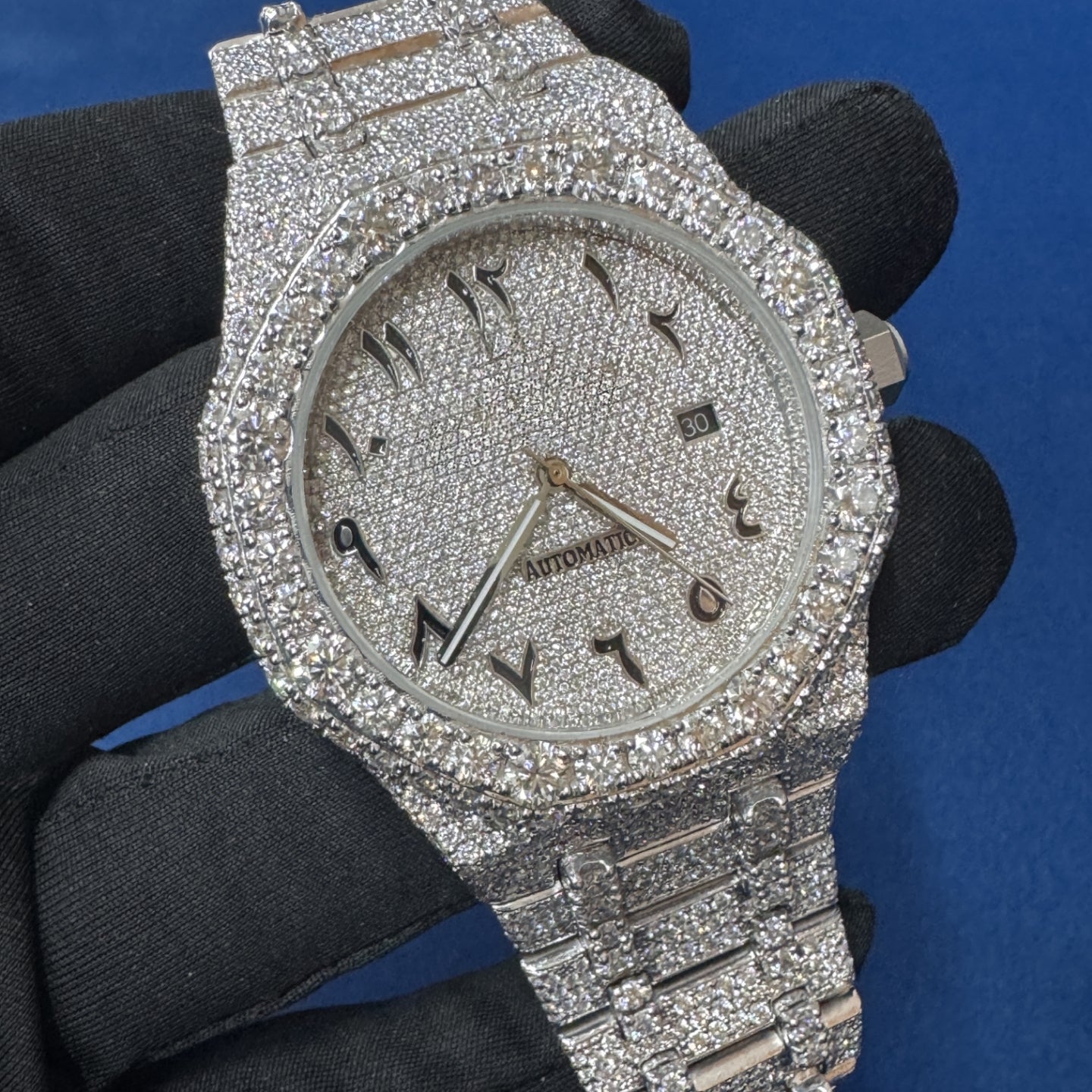 Iced out VVS lab Diamond Arabic Dial Bust Down Hip Hop Watch